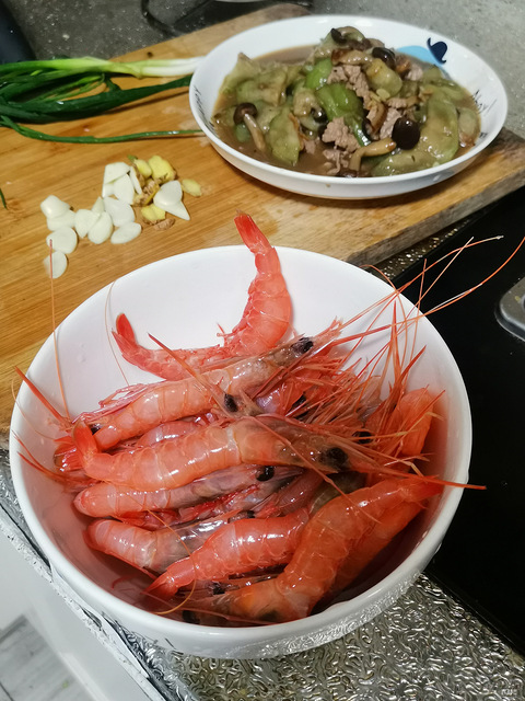 中午买的,25一斤共15元,买的时候感觉很新鲜到家也就十几分钟,晚上烧得时候臭臭的,虾肉也有点松散再来个丝瓜炒肉和蟹味菇再来点饭前水果!