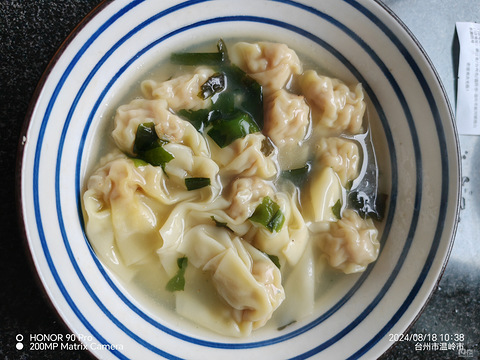 路过这家店,想尝尝云吞咋样,买了九块钱的15个云吞,生的,中午回家煮,水开下云吞,煮五分钟就好了,我把料包也放下去一起煮了,有点鲜,味道还是可以的,改天再去买一份吃吃,上午九点开门,不能当早餐
