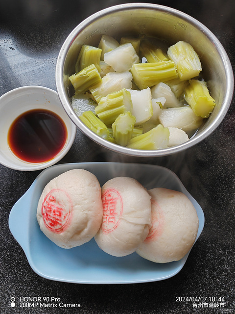冰箱里三个馒头,地里砍的芥菜,掰了叶子洗洗,切块,白水煮熟,酱油醋蘸蘸,馒头微波炉加热,中午饭就解决了