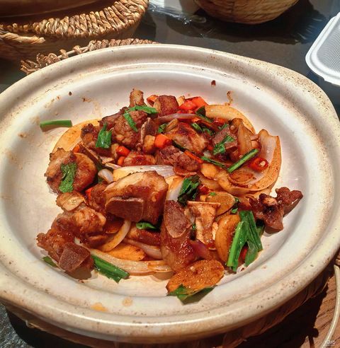 路桥中盛的胡叨叨,已经吃过好多次了,价格实在,味道也在线这次两个人吃就点了四个菜,本人最爱猪蹄凤爪,猪蹄和凤爪都炖的软糯脱骨,猪蹄的肥肉也不多,很喜欢第二爱大头虾黑胡椒奶油,我不是一个很爱吃甜的人,但这道菜的黄油是四道菜里面最浓的,没想到越吃越上头,几乎每次来都点的一道菜第三海胆卤肉焗饭,我这这人超爱这种砂锅类拌饭,米也是细长米看得出来用料不错,一般主食都会点这个,吃的也饱,其他的像什么捞饭啥的吸