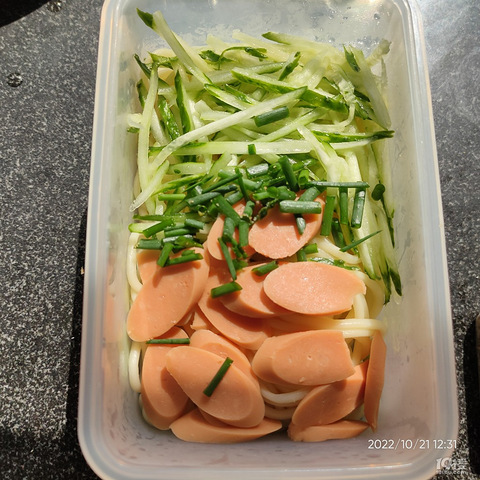 一大早去超市,菜场,面条加工点,都没有凉皮卖 ,退而求其次,买了凉面,煮开过一遍凉开水,铺上黄瓜丝,火腿肠葱花,油泼辣子+凉面汁,花生碎和饼干碎,绝对好吃哦!