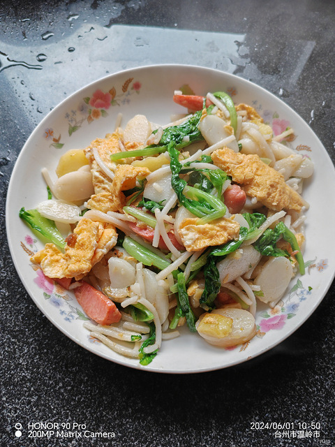 中午下楼十点多了,做饭来不及,冰箱里有小年糕,粗面,洗点生菜,摊两个鸡蛋,火腿肠来两根,用猪油炒,油热放火腿肠煎一下,放年糕炒炒炒,再放油炸过的土豆片,加盐,一圈老酒,再放入粗面,尽情翻炒,最后放生菜,鸡蛋拌匀