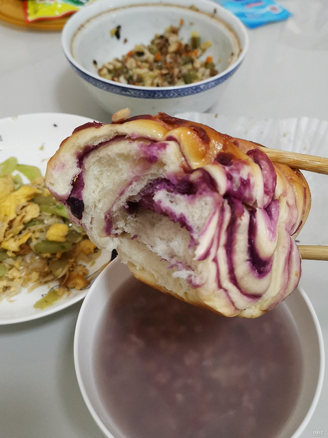 今日早饭,杂粮泡饭黄瓜炒鸡蛋虾皮+紫薯面包缇贝客的面包12元已经算便宜了紫薯算一个,当天还是比较柔软的今天半个,来个泡饭