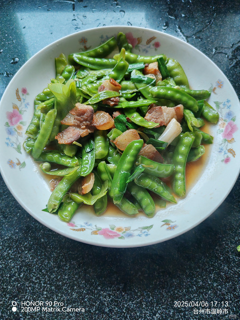 腊肉切片,煎豆撕掉筋膜,洗干净,大蒜来一根,腊肉用中小火煸出油,放大蒜根煎一下,放入煎豆煸炒,加盐,一圈老酒,略微加点水,煮开放大蒜叶子翻炒,再煮一分钟,加鸡精,出锅。