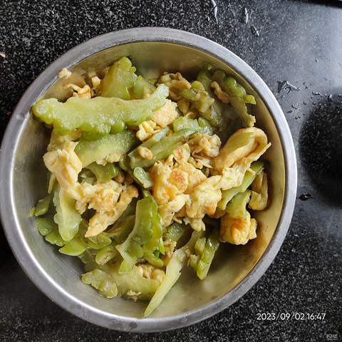 老妈说有点上火,每个苦瓜炒鸡蛋吧!苦瓜切片,鸡蛋打散炒香盛出来,炒苦瓜,再加入鸡蛋,拌匀,可以了