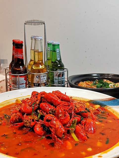一家露营风的接地气小店!点了红烧小龙虾、烈火牛肉、啫啫牛肉、啫啫鱿鱼仔、啫啫胖头鱼、芝士玉米、避风塘小酥肉、焗鸦 片鱼头……都不错,啫得,焗得都很入味!特别适合三五好友小聚小酌!中午营业!