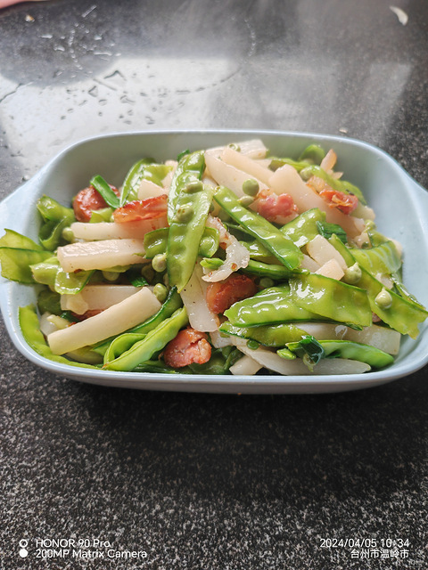 自家种的剪豆,这是第一顿,剪豆荚批筋洗干净,香肠切片,油热放香肠片,煎一下,放大蒜,然后放剪豆荚炒炒,八分熟放年糕,加盐鸡精,年糕炒好了放大蒜叶子,翻两下出锅