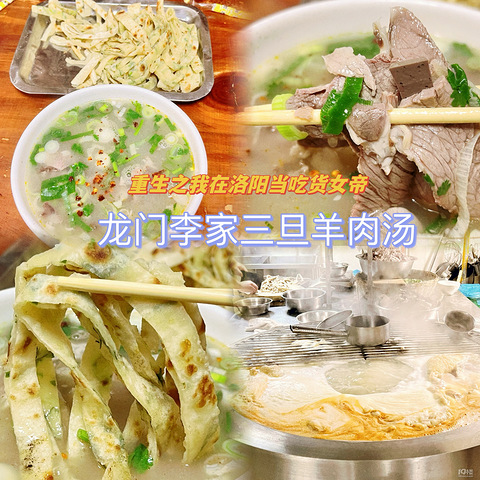 女帝早朝前喝汤吗?老洛阳人的早上一定得喝上早汤,羊肉羊骨加以大料在锅里嘟嘟嘟的熬制若干小时,精髓都在这汤里。河南的白沙,铁谢羊汤最出名,在市区这家三旦羊肉汤更加方便,洛阳本地朋友都推荐。羊杂汤10元起,丰俭由人,花了20块,肉挺多汤一点都不膻。喜欢吃辣的一定放辣子,加点盐,更地道。喜欢清爽的要原汤,也可以加羊油(羊肥肉)的厚重口感。去对面店配个饼丝,泡着吃更有感觉。至于后劲如何?一打嗝,上头,羊味