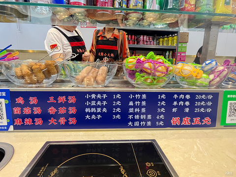 吃完了我还没记住人家这家店叫啥名字 反正就是叫旋转小火锅就在耀达路步行街 现代天地对面感觉挺干净的 想吃啥自己那 位置前面都有说明那些签子的多少钱锅底是5元 调料自助2元(以前吃的一家调料好像不收费的)东西很多 都不知道吃啥了 一遍吃着锅里的 一遍眼睛还盯着上面看看再拿点什么菜种类也很多 下次还要去