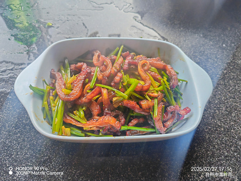 年前晒的鳗鱼鲞,昨天别人给了一把芹菜,鳗鱼鲞洗干净老酒泡一下,热锅凉油放姜片煎一下,放鳗鱼鲞炒炒炒,加盐,耗油,白糖,一圈老酒,再放芹菜段炒熟放鸡精拌一下就可以了