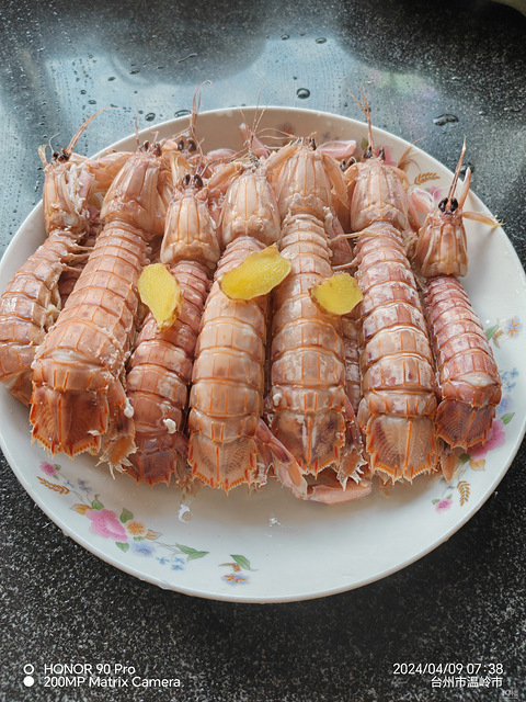 弟弟一大早买了好多菜,皮皮虾我洗洗就煮了,几片姜片,一点老酒,水开放皮皮虾,煮熟捞出来,我开吃了
