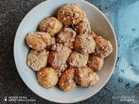 做冬至,冬至圆必须要,图省事,买了包芝麻汤圆,煮开再煮三分钟,捞出来控干水,放豆黄粉和红糖的盘子里,一个一个裹一圈,可以了,我觉得蛮好吃的,一个人干了一大半