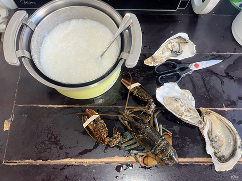 跟男朋友一起做个波龙生蚝粥波龙还是适合清蒸,盒马122一只重量400-500g,第二天看到麦德龙99一只,重量一样,被背刺了!好想念梭子蟹季,那个更好吃!
