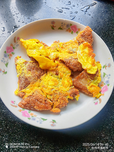 红船的金典肉粽来两个,切片,鸭蛋打蛋液,热锅倒油放入肉粽片,煎两面金黄,倒入蛋液,两面熟就可以了。