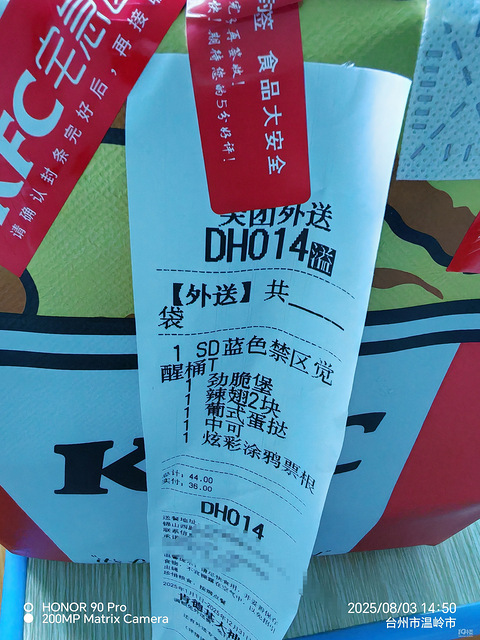 就为了这周边,点了KFC,汉堡,鸡翅,蛋挞,可乐,店里45块钱,外卖36块钱,早上去店里买,说周边9:30开始,下午点个外卖,当下午点心了。