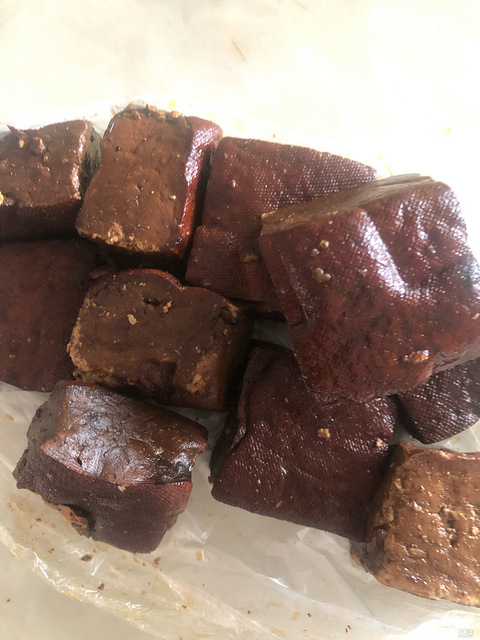 沙阜豆腐干,从某某银行里买的,这银行开的和超市一样,真是啥都卖。便宜的,2块钱一袋。特别喜欢吃这豆腐干,放点肥肉,然后在高压锅里煮,这样煮出来的豆腐干就有气泡孔一样的