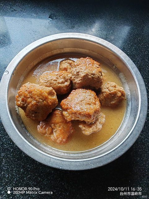 早上买了两斤后腿肉,都放进冰箱了,忽然想做个肉圆吃吃吧,拿出来,绞肉,加盐,一点点水,鸡精,老酒拌匀,锅里倒油,油热放做好的肉圆两面煎黄,一圈老酒泚一下,加开水小火炖煮15分钟,可以了