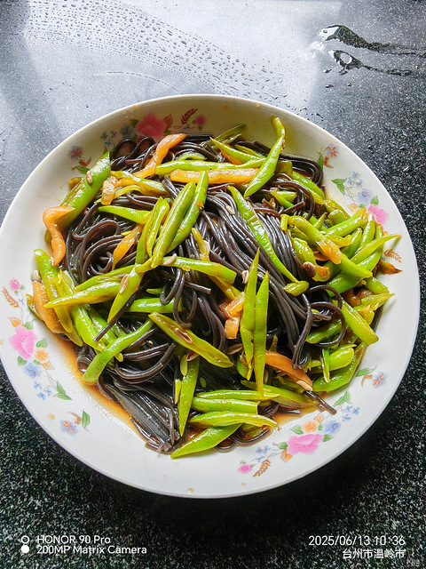 舅妈给我四季豆,洗干净撕掉筋膜,斜刀切,下雨天没出去买菜,就素烧,锅里油热放一小包榨菜,倒入四季豆,翻炒,放生抽耗油,老酒一圈,加水煮开,舀出来一小碗汤汁,放入蕨根粉条,煮开把那一碗汤汁重新倒锅里,焖煮五分钟,加鸡精拌匀就可以了。