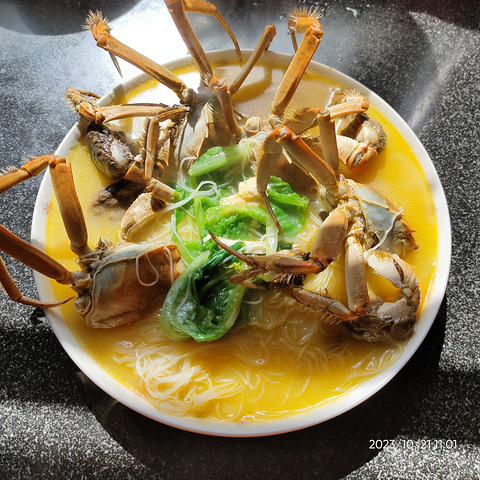 买了五只田蟹,三只红烧,两只煮面,每一只都很肥,汤金黄色的,好好看,加了一颗生菜,颜色更赞了