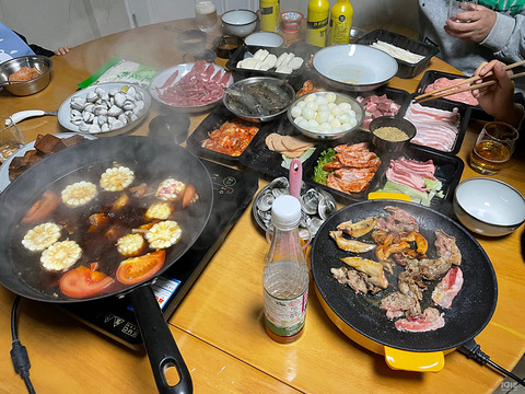 天气冷起来了,火锅配烤肉绝对可以约上朋友,在家小火锅搞起来,怕不够吃又点了烤肉 火锅锅底一般是:筒骨汤豆腐干农港城拐弯那家卖的豆腐干我感觉是我吃过最好吃的(吃过磨石桥的、路桥中心菜场的、农港城、沙埠的、宁溪的、各个小地方)宁溪主要卤水豆腐,吃不惯的可能不是很喜欢,沙埠的太久远了忘了味道,农港城的确实不错汤底好了之后,豆腐干、筒骨盛出来,再放入锅中加点番茄、玉米就可以做汤底了(其实很淡,但是家庭版这