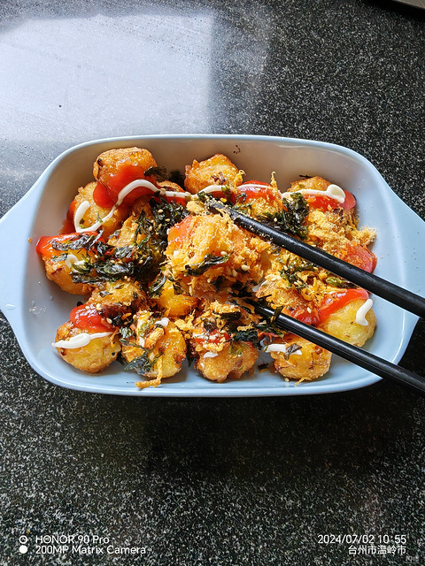 土豆蒸熟放盐,白胡椒粉,捣泥,加玉米淀粉,加包心菜丝鱿鱼小块,揉成团,然后一个一个搓成小丸子,面粉加水调个糊,油热滚一圈面糊一个一个下锅炸,炸成金黄色就可以了,摆盘,加肉松,芝麻海苔,沙拉酱,番茄酱,开炫