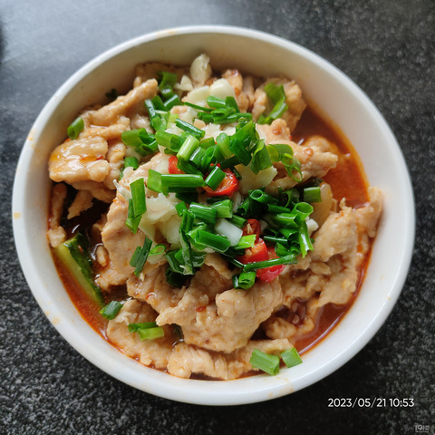 周末是长肉肉的,水煮肉片,可以安排,片肉,上浆,煮,下肉片,葱花蒜末,热油浇,开吃