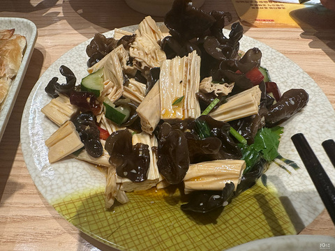 「肉眼牛排」,要了8分熟,柔软、多汁,配蘑菇酱足够美味。自助区品种丰富——新鲜沙拉、粗粮、水果应有尽有,但最惊艳的当属小菜台:凉拌黑木耳脆嫩爽口,鱼皮泡椒味,一勺接一勺,好吃!