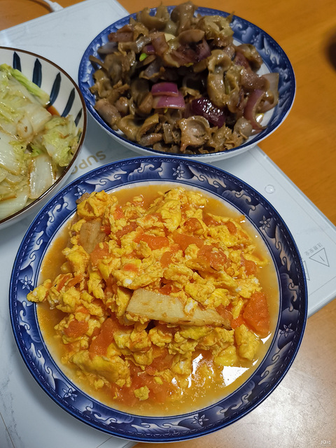 今天一荤两素,有什么做什么高压锅炖了大半小时的大肠!洋葱炒大肠,西红柿炒鸡蛋清炒大白菜!全靠大肠下饭,很多人不吃,我觉得挺好吃的