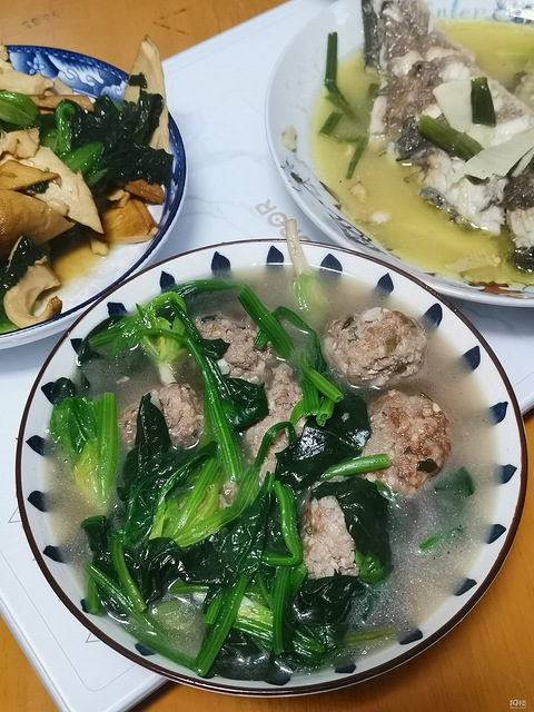 最爱的菠菜肉圆吃菠菜,菠菜得焯水再来个家里有什么吃什么青菜炒豆干最后来个鱼2-3个人也够吃的!