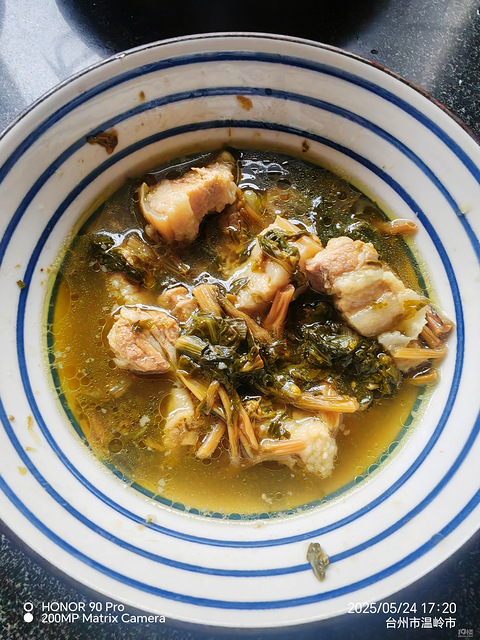 这个梅干菜自家晒的,很嫩,梅干菜和五花肉放高压锅,加一点点盐,老酒,加水,高压锅上汽十分钟光火,就可以了
