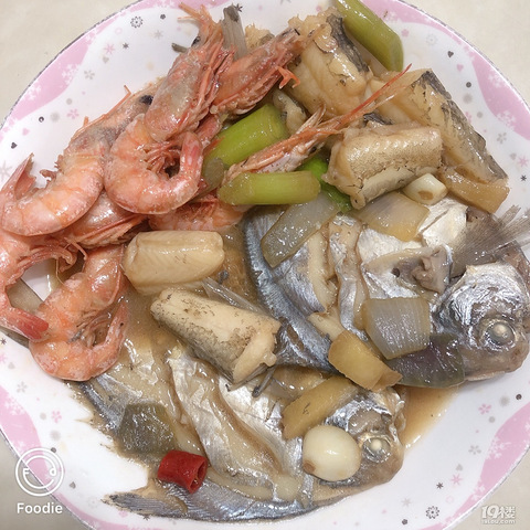 水潺,虾,鲳鱼,三拼烧烧。肉圆肉质嫩,也挺好吃。再来一盘炒油冬菜@台州小帮帮06