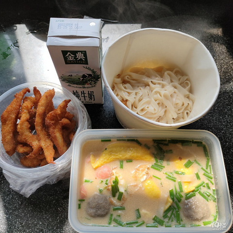 前几天酸辣粉汤面没分装,半小时后粉条坨了,这次分装了一下,味道和刚出锅差不多呢!怕不够吃,炸了一份鸡柳,再配一盒纯牛奶,完美