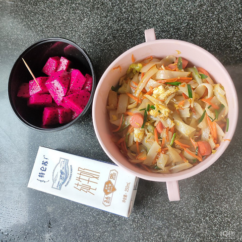 侄女昨晚说今天中午想吃炒河粉,早上去买了八两河粉,中午加了火腿肠,鸡蛋,生菜胡萝卜丝炒炒,三分钟搞定了,配了一个火龙果,一盒牛奶,十块钱标准差不多了吧!