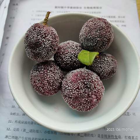 上个星期六冻的五盒杨梅,吃了剩下两盒了,早饭后来几颗尝尝味道,嗯,好好吃哦!甜甜的,冰冰的,赞