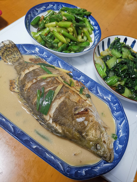 自己做的肉皮冻沾点大蒜油醋过年朋友送的鳜鱼炒了洋葱?猪肝蒜蓉芦笋,提前焯水再炒可以很嫩还有自己种的青菜