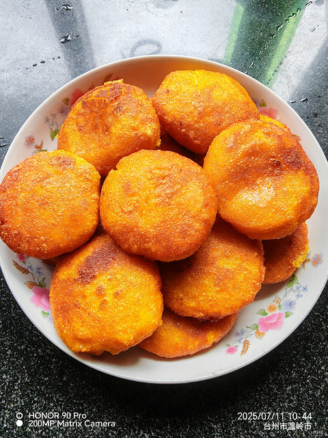 中午下班回家,老爸已经煮了南瓜揉好粉团了,我做了南瓜饼,油煎,煎的时候一定要有耐心,中小火,快熟了按压一下饼,会鼓泡,肯定熟了,好吃!