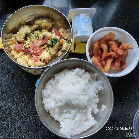 下午回家有点迟了,来不及做饭了,简简单单炒个鸡蛋火腿肠,炸鸡柳,配一碗米饭,带一盒酸奶,十分钟搞定了。