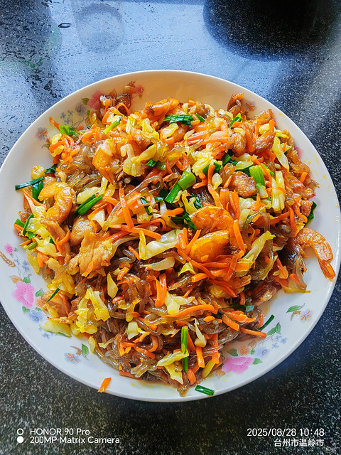 绿豆面泡水里半小时,我早上出门上班泡着,等我想起来已经俩小时了,赶紧回家捞出来,锅里放肥肉煸出油再放瘦肉,炒变色放虾干,煎一下,再放入胡萝卜丝和包心菜炒炒,然后放入泡好的绿豆面,翻炒翻炒,加盐生抽,一圈老酒,多炒一会,加鸡精,放葱段,出锅。