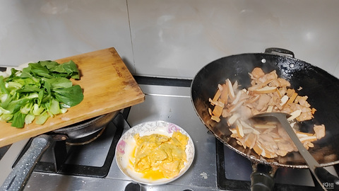 又去邻居地里挖了些洋姜,用麻辣香肠炒炒。洋姜用牙刷刷干净,切片,麻辣香肠切片,锅里倒油,放入香肠煎炒,再放入洋姜片,炒炒,加点盐,一圈老酒,翻炒变色放一点水,煮开加鸡精就可以了