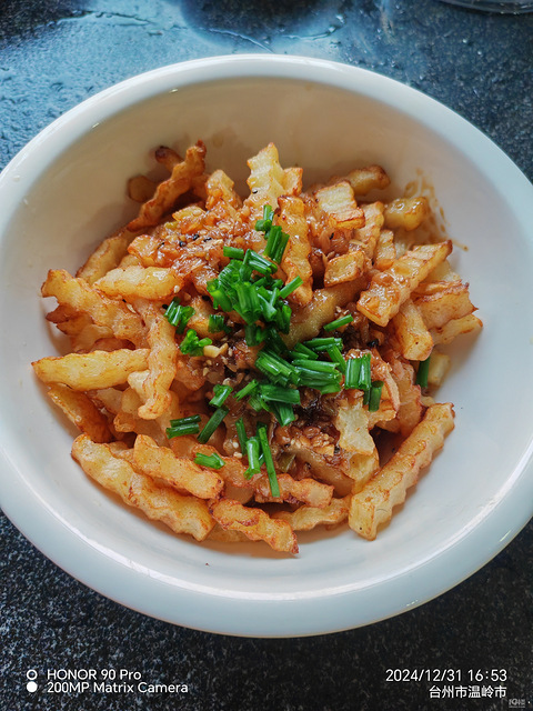 上午买了两个土豆,中午削皮切条洗两遍,泡水里,沥干水分,然后油热放入土豆条,炸好捞出,等油温上来了复炸一遍,倒入拌鞋底都好吃的的料汁,开炫