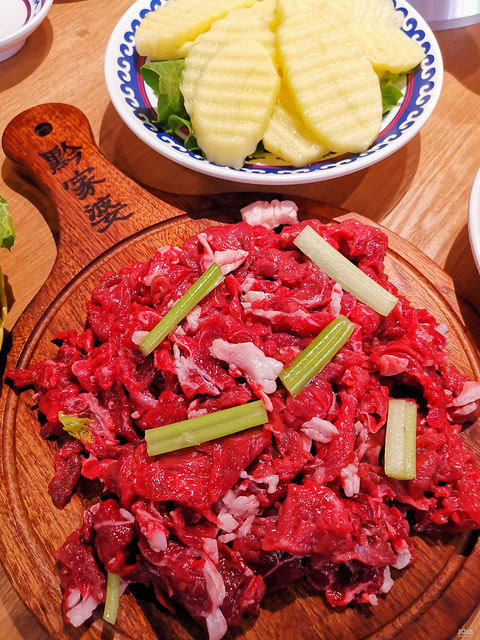 牛肉很新鲜,配酸汤,原汤都好吃!土豆和黑豆花配酸汤火锅也不错,自助蔬菜四五种,还有自助水果西瓜很甜!!!!