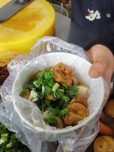 南边入口的蔡阿姨卤味一锅煮的,微微辣,很香咸,适合我,周记有点太辣了6.6的套餐性价比不错当晚饭或点心足够了一根小肠卷五个油泡一根年糕放了葱花和香菜,不错不错