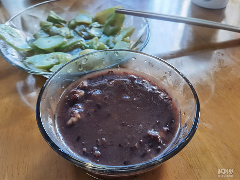 放了糯米一把煮的黑米粥就是不一样另外加了核桃,花生炒个菜宏,蒸了包子