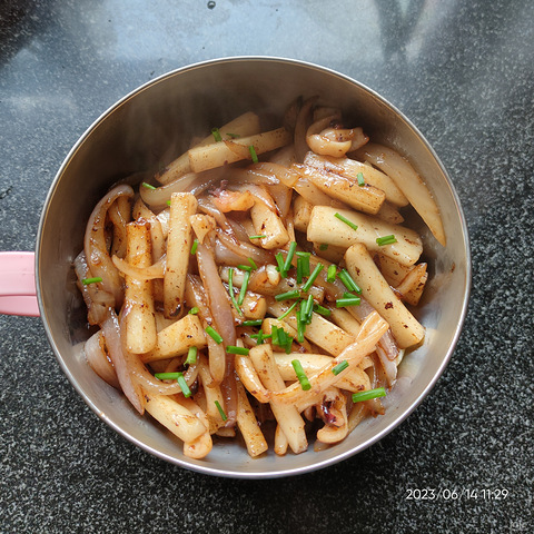 一直鱿鱼炒年糕都用韭菜,刚准备割韭菜,老妈说我爸好像打药了,那就用洋葱吧,味道也不错呢!纯牛奶咕咕