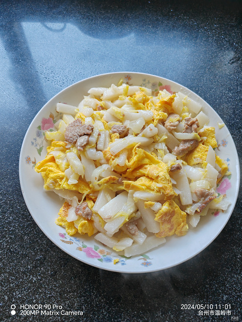 这是去年年底做的最后两根水浸糕,上午买了条里脊肉,切了一点,摊两个鸭蛋,一颗娃娃菜,和年糕炒炒,我还是喜欢吃现做的年糕,。