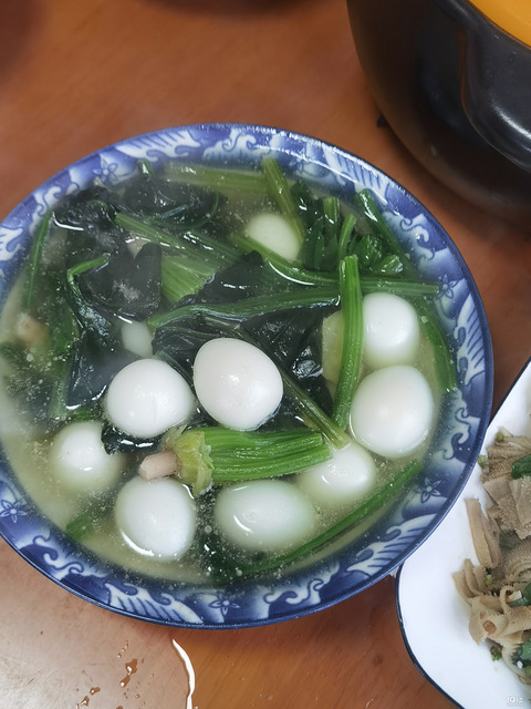 吃火锅剩的百叶,焯水一下多点蒜,醋什么拿来拌一下就可以吃了!还炖了一只老鸭顿好久的那种,不加虫草花真的不好看菠菜焯水,和鹌鹑蛋煮汤!