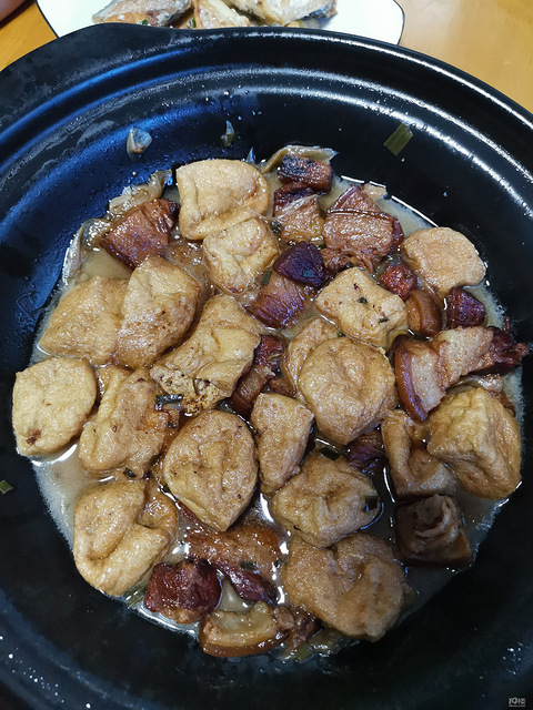 昨天剩的红烧肉买两元油豆腐砂锅煮今天晚餐缺了点绿叶子,待会吃水果补充吧~炒平菇,肉圆蒸米饭上带鱼一些!