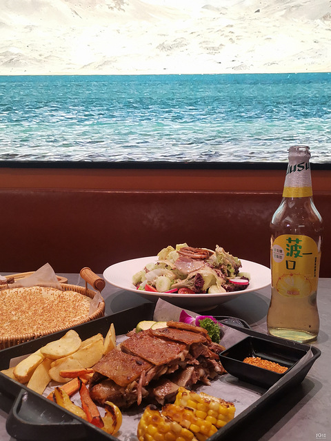 哇,这里的焖烤羊排真赞 一秒进入异域风景的新疆地界,大厅白沙湖的风景画特别美,没想到和田焖烤羊排如此优秀外表酥脆,里面脱骨软烂,估计就是焖烤的功劳吧!配了土豆,玉米,西葫芦荤素搭配,好吃又健康!