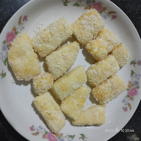买了两箱纯牛奶,天天造,家里玉米淀粉还有吗,有,好几包呢,那就做个炸鲜奶吧,白色面包糠,所以颜色不是很美丽,用空气炸锅炸的,喷点油就好了,油炸太油腻了