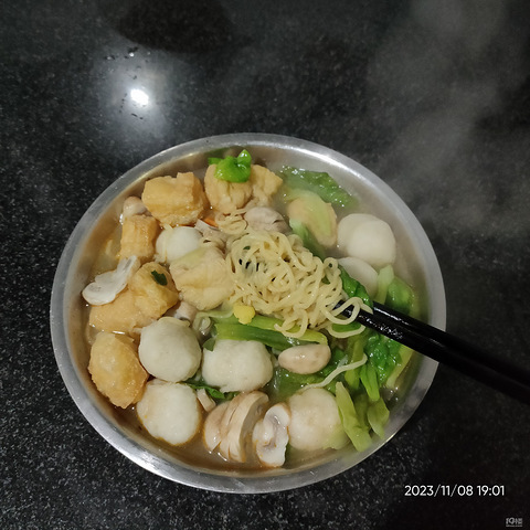 饿了,吃点零食就好了,结果感觉还想吃点啥,煮个方便面吧!贡丸,鱼丸,蘑菇,油泡,还差点意思哈,门口老妈种的生菜拔一颗,洗洗放下去,嗯,不错